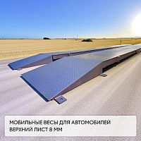 Предназначены для взвешивания небольших автомобилей с короткой базой до 8 метров и грузоподъемностью до 50 тонн. Весы данной модели легко транспортируются и устанавливаются, основание для весов дорожные плиты или бетонное основание. Преимущество данной модели весов это мобильность, простой монтаж.