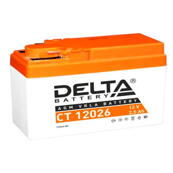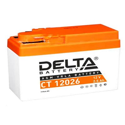 Герметизированный необслуживаемый VRLA cвинцово-кислотный стартовый аккумулятор Delta CT 12026 напряжением 12В и емкостью 2.5Ач. Обладает стартовым током в 45А. Полярность - боковая (- +). Аккумулятор соответствует следующему коду YUASA: YTR4A-BS. Разработан специально для пуска двигателей мототехники. Изготовлен по технологии AGM (с микропористым заполнителем, пропитанным электролитом) из негорючего ABS пластика. Срок службы аккумулятора достигает 3-5 лет. Высокая стартовая мощность и повышенная энергоотдача. Адаптирован к Российским условиям эксплуатации.