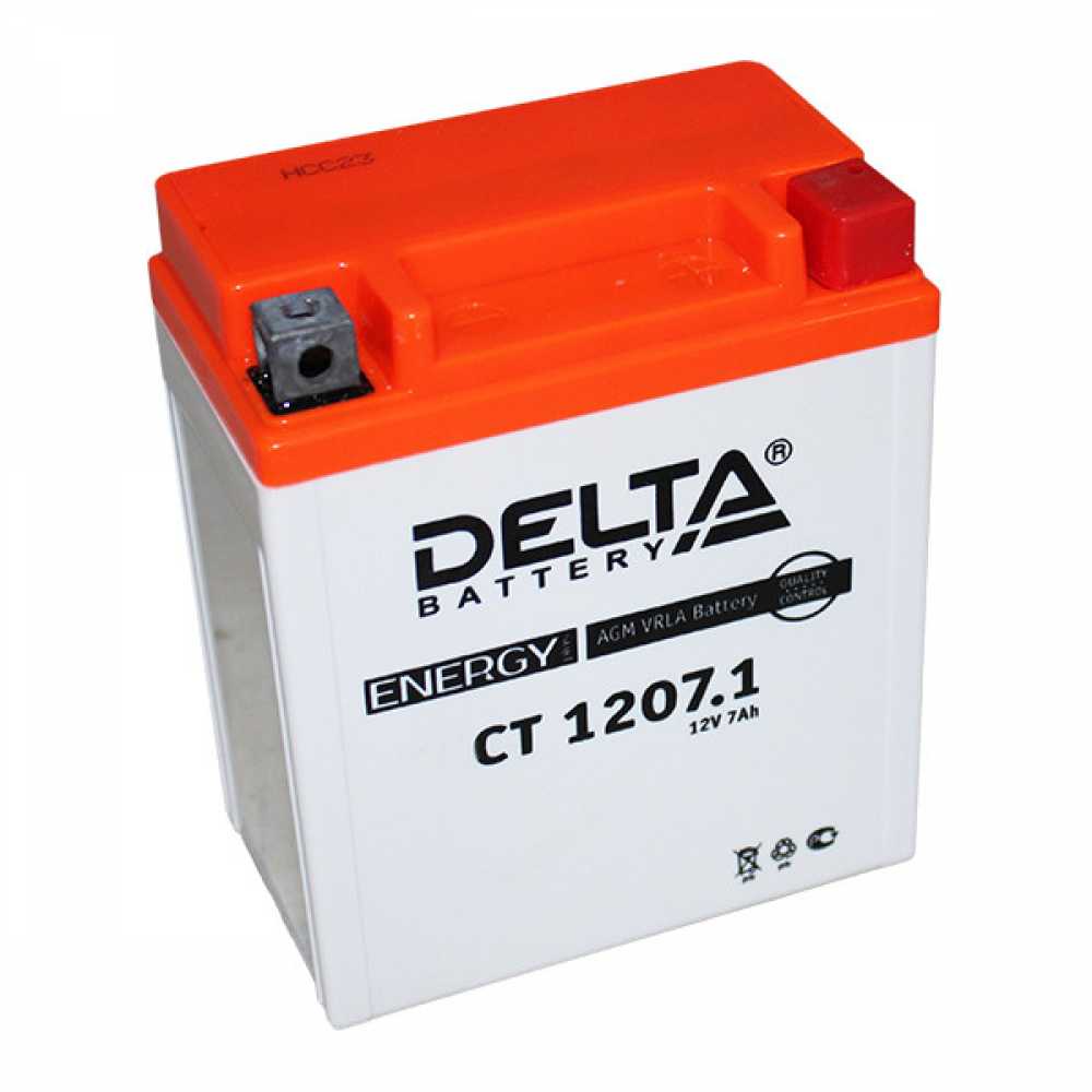 Герметизированный необслуживаемый VRLA cвинцово-кислотный стартовый аккумулятор Delta CT 1207.1 напряжением 12В и емкостью 7Ач. Обладает стартовым током в 100А. Полярность - обратная (- +). Аккумулятор соответствует следующему коду YUASA: YTX7L-BS . Разработан специально для пуска двигателей мототехники. Изготовлен по технологии AGM (с микропористым заполнителем, пропитанным электролитом) из негорючего ABS пластика. Срок службы аккумулятора достигает 3-5 лет. Высокая стартовая мощность и повышенная энергоотдача. Адаптирован к Российским условиям эксплуатации.