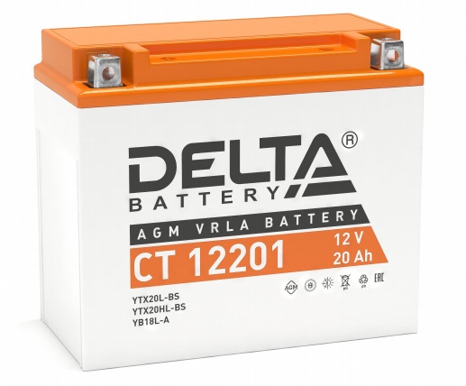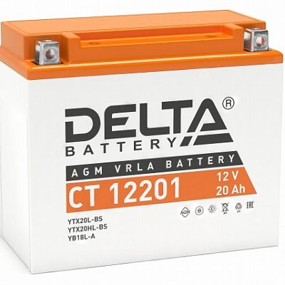 Герметизированный необслуживаемый VRLA cвинцово-кислотный стартовый аккумулятор Delta CT 12201 напряжением 12В и емкостью 20Ач. Обладает стартовым током в 270А. Полярность - обратная (- +). Аккумулятор соответствует следующему коду YUASA: YTX20L-BS, YTX20HL-BS, YB16L-B, YB18L-A. Разработан специально для пуска двигателей мототехники. Изготовлен по технологии AGM (с микропористым заполнителем, пропитанным электролитом) из негорючего ABS пластика. Срок службы аккумулятора достигает 3-5 лет. Высокая стартовая мощность и повышенная энергоотдача. Адаптирован к Российским условиям эксплуатации.