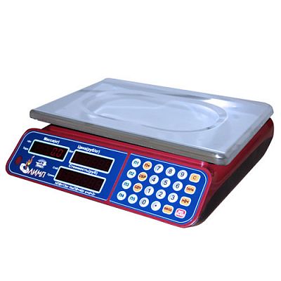 Электронные торговые весы, со стойкой, Max=15кг; Min=40г; e=2/5г; платформа 355х235мм нерж., индикация - на стойке: продавца и покупателя: - светодиодная, рассчет сдачи, питание: сеть, аккумулятор.