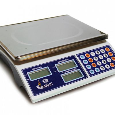 Электронные торговые весы без стойки, Max=6/15кг, Min=40г, e=2/5г, платформа 230х300, дисплей ЖКИ ("ЦЕНА" - 6 разрядов, "СТОИМОСТЬ" - 7 разрядов), режимы: тара, суммирование стоимости, подсчет сдачи, 4 ячейки памяти, универсальное питание: сетевой адаптер 220В/6В/600мА, аккумулятор 4В/4Ач, батарейки R20 1,5Вх3шт, рабочий темп.режим: 0-+40 градС, вес-2,8кг