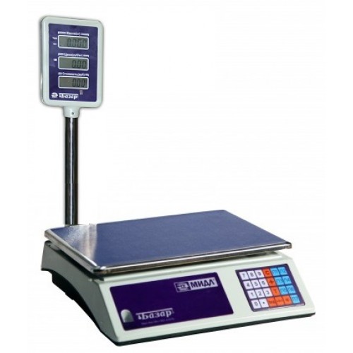 Электронные торговые весы со стойкой, с ЖК дисплеями покупателя и продавца, питанием от АКБ. Для взвешивания, фасовки и определения стоимости товара. Память на 7 товаров. НПВ 30кг. Точность 5 г.