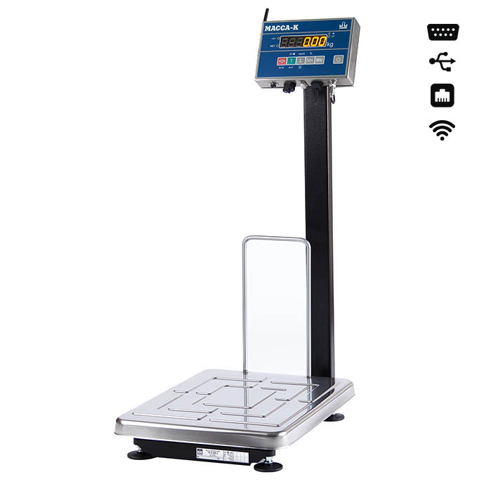 Напольные товарные весы с вертикальной стойкой и улучшенной влагозащитой. Предназначены для измерений массы товаров при торговых, учетных и технологических операциях. Терминал весов в корпусе из нержавеющей стали. Возможна работа в счетном и дозаторном режиме, режимах процентного взвешивания и контроля массы (компараторный режим). Встроенный аккумулятор обеспечивает автономную работу весов до 15 часов. Весы легко интегрируются в системы учета. 1С совместимы. Обмен информацией с внешними устройствами реализован по интерфейсам RS-232, USB, Ethernet и Wi-Fi. Настройка сетевых параметров Ethernet и Wi-Fi осуществляется с помощью ПО "Настройка весов 100" (Драйвер 100). Весы могут являться как клиентом, так и точкой доступа сети Wi-Fi. При подключении весов в режиме точки доступа Wi-Fi, дополнительно, реализовано отображение веса на телефоне или планшете (Приложение на Android).