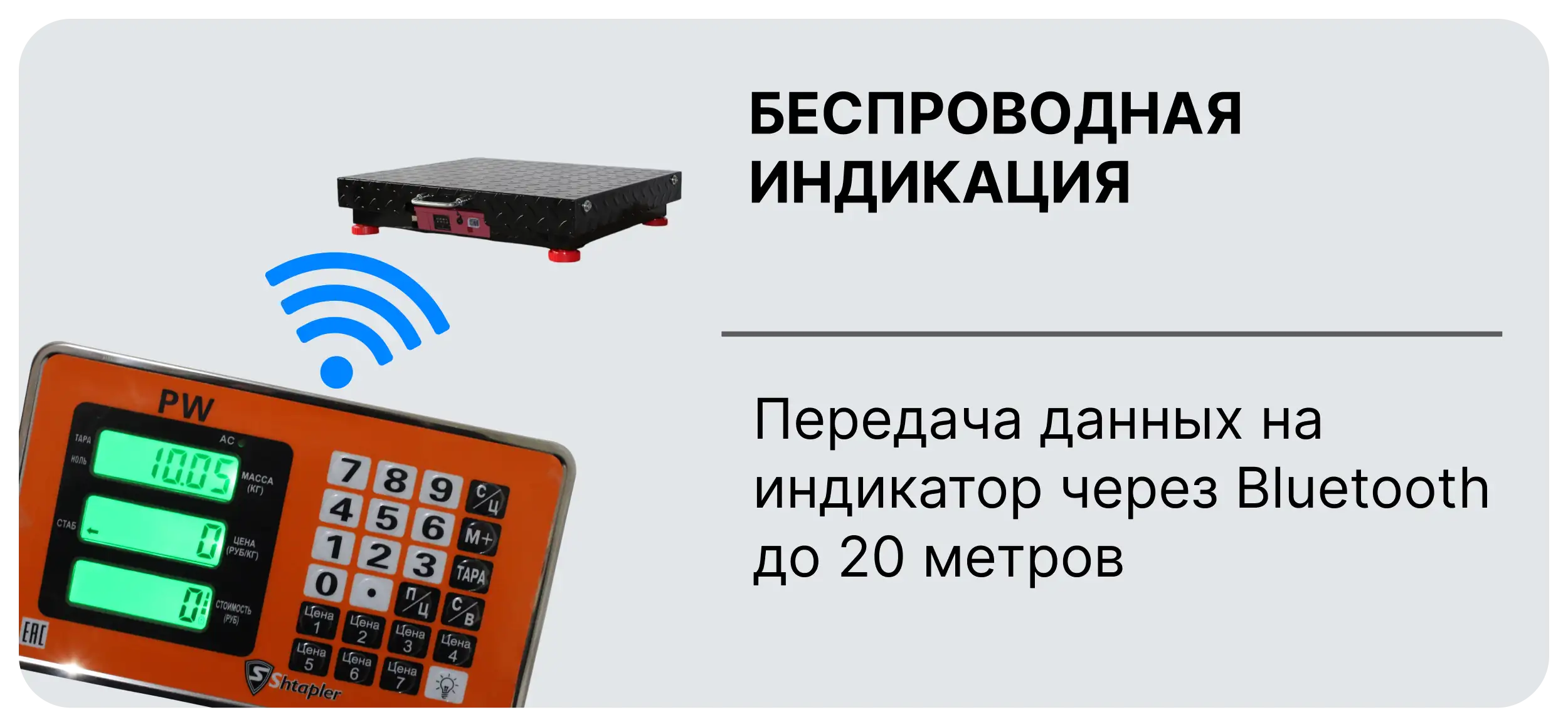 Беспроводные напольные товарные весы со стойкой Shtapler PW подойдут для рынков, супермаркетов, складов, промышленных и сельскохозяйственных предприятий. Корпус индикатора выполнен из нержавеющей стали, связь с платформой осуществляется через Bluetooth, что позволяет свободно размещать его независимо от положения платформы. Весы работают с режимами тарирования и суммирования. Дисплей повышенной яркости облегчает считывание информации при работе на улице при ярком солнце. Работа от сети и от аккумулятора позволяет использовать весы как в помещении, так и на улице вдали от сети. Беспроводная модель представлена в нескольких модификациях: НПВ 150, 300 и 600 кг, размер платформы 32*42 см, 42*52 и 50*60 см соответственно. Есть модели с обычной и складной стойкой.