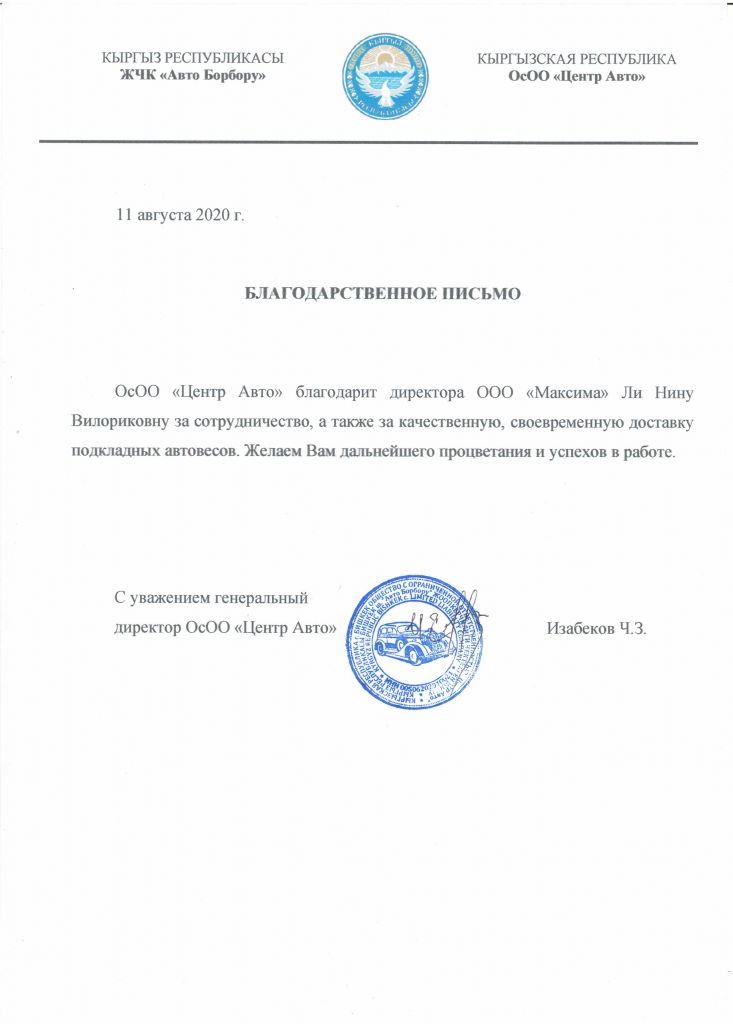 ООО "Центр Авто" благодарит директора ООО "Максима" Ли Нину Вилориковну за сотрудничество, а также за качественную, своевременную доставку подкладных автовесов. Желаем Вам дальнейшего процветания и успехов в работе. Генеральный директор ООО "Центр Авто" |